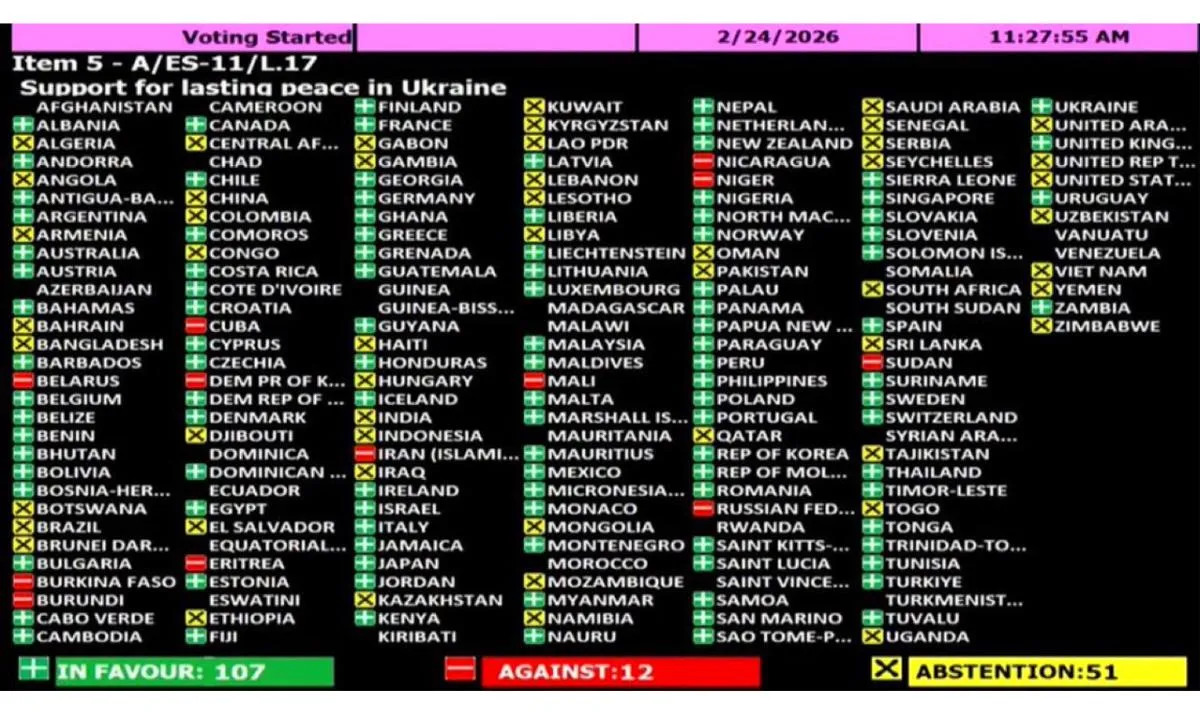Ukrayna'nın girişimiyle ve 46 ülkenin ortaklığıyla sunulan karar tasarısı için yapılan oylamada 107 lehte, 12 ret ve 51 çekimser oy kullanıldı.