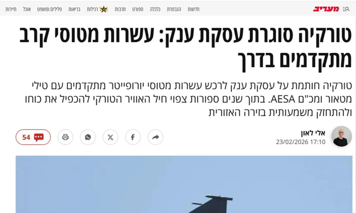 Ankara'nın attığı her adımı yakından takip eden İsrail medyası son olarak "Türkiye dev anlaşmayı tamamladı: Onlarca gelişmiş savaş uçağı yolda" başlığıyla okuyucularının karşısına çıktı. İsrail merkezli Maariv gazetesi, Ankara'nın bünyesine katacağı Eurofighter'ların AESA radar teknolojisi ve gelişmiş Meteor füzeleriyle donatıldığı, bu alımın son derece kritik ve büyük ölçekli bir hamle olduğu söyledi.
