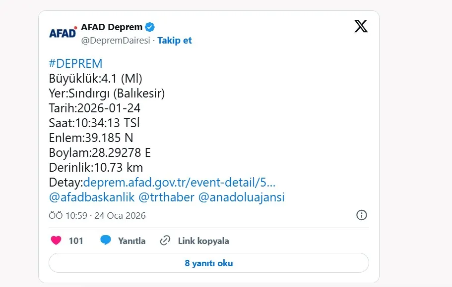 Afet ve Acil Durum Yönetimi Başkanlığı (AFAD) verilerine göre, gece saat 00.24'te merkez üssü Sındırgı olan 5.1 büyüklüğünde deprem oldu. Yerin 11 kilometre derinliğinde meydana gelen deprem, çevre il ve ilçelerde de hissedildi. Bölgede herhangi bir olumsuzluk yaşanmadığı bildirildi.