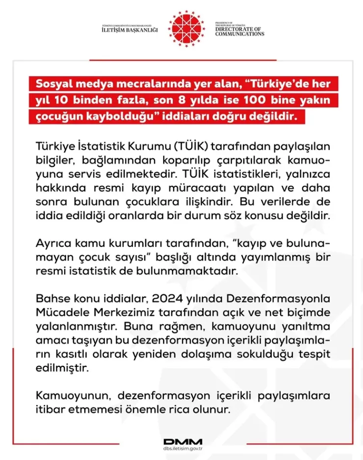 "Türkiye’de her yıl 10 binden fazla, son 8 yılda ise 100 bine yakın çocuğun kaybolduğu” iddialarıyla ilgili Dezenformasyonla Mücadele Merkezi'nden açıklama yapıldı. Açıklamada, "Bahse konu iddialar, 2024 yılında Dezenformasyonla Mücadele Merkezimiz tarafından açık ve net biçimde yalanlanmıştır." denildi.
