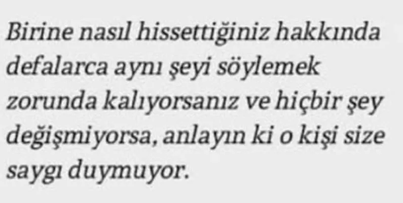 "Birine nasıl hissettiğiniz hakkında defalarca aynı şeyi söylemek zorunda kalıyorsanız ve hiçbir şey değişmiyorsa anlayın ki o kişi size saygı duymuyordur"