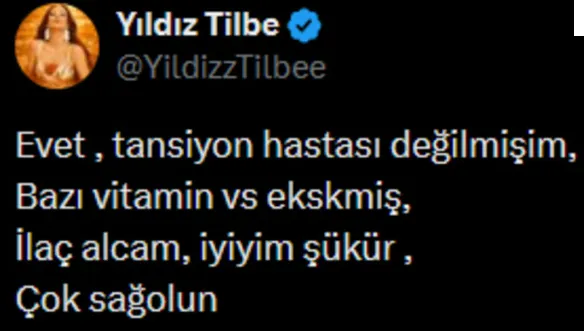 Önceki açıklamasında "Tansiyonumu indirmeye çalışıyoruz. Tansiyonum çıkıyor. Sonuçlara göre değerlendirme yapılacak" diyen ünlü isim X hesabından son durumunu "Tansiyon hastası değilmişim. Bazı vitaminlerim eksikmiş. İlaç alacağım. İyiyim şükür. Çok sağ olun" sözleriyle paylaştı.