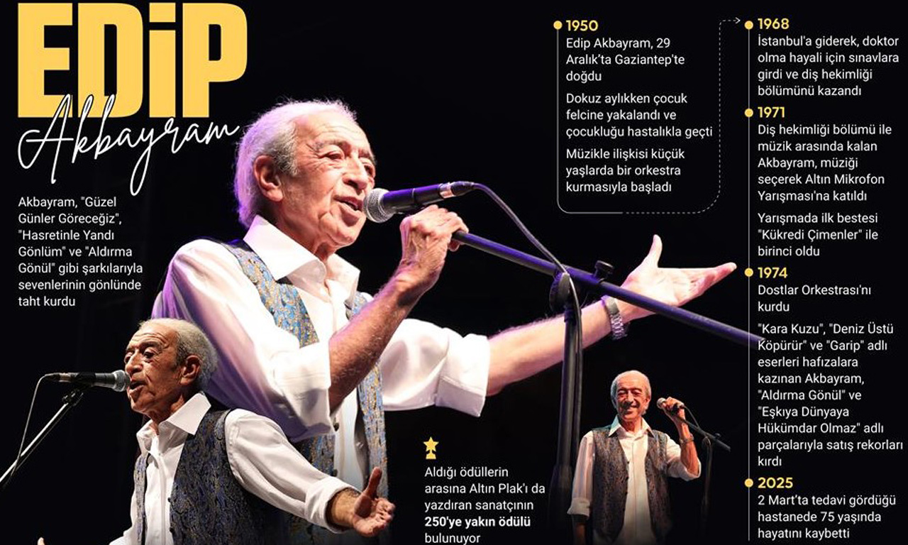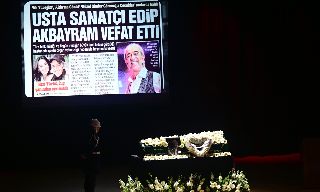 Bugün 2 Mart'ta hayatını kaybeden usta sanatçı Edip Akbayram için veda günü. Geçirdiği iç kanama sebebiyle 2 aya yakın hastanede tedavi gören Akbayram için Harbiye'deki Cemal Reşit Rey Konsere Salonu'nda tören düzenlendi. Edip Akbayram'ın anma töreninde eşi Ayten, kızı Türkü ve torunu gözyaşlarına hakim olamadı. Merhum sanatçı Teşvikiye Camii'nde kılınan cenaze namazının ardından Karacaahmet Mezarlığı'na defnedildi.
