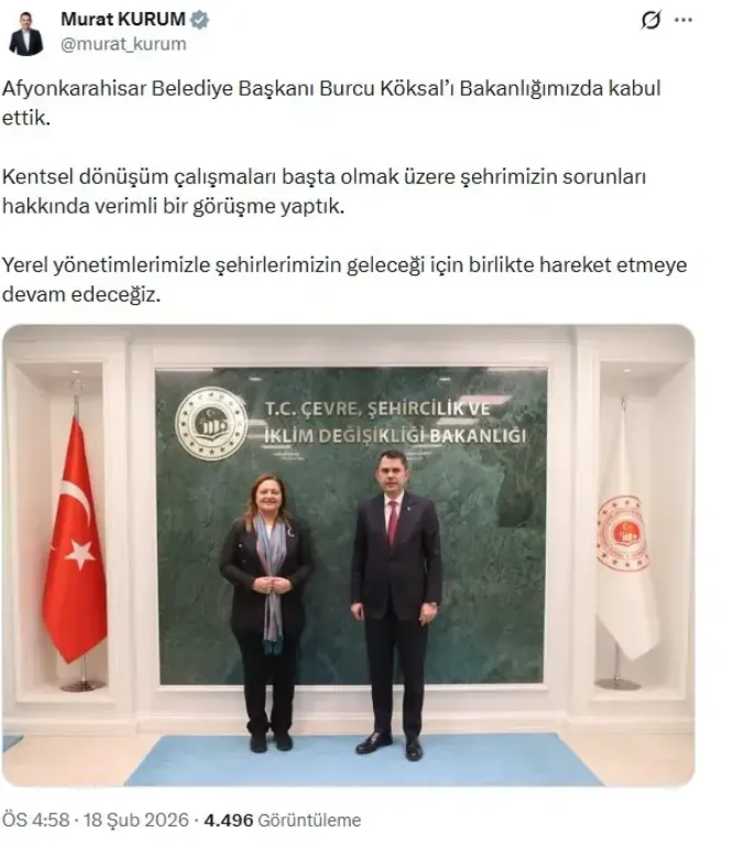 Köksal'ın bu ziyareti, siyasi kulislerdeki iddiaların aksine yerel yönetim projeleri kapsamında gerçekleştirilen kurumsal bir görüşme olarak kayıtlara geçti. Bakan Kurum, ziyarete ilişkin yaptığı açıklamasında "Afyonkarahisar Belediye Başkanı Burcu Köksal'ı Bakanlığımızda kabul ettik." dedi.