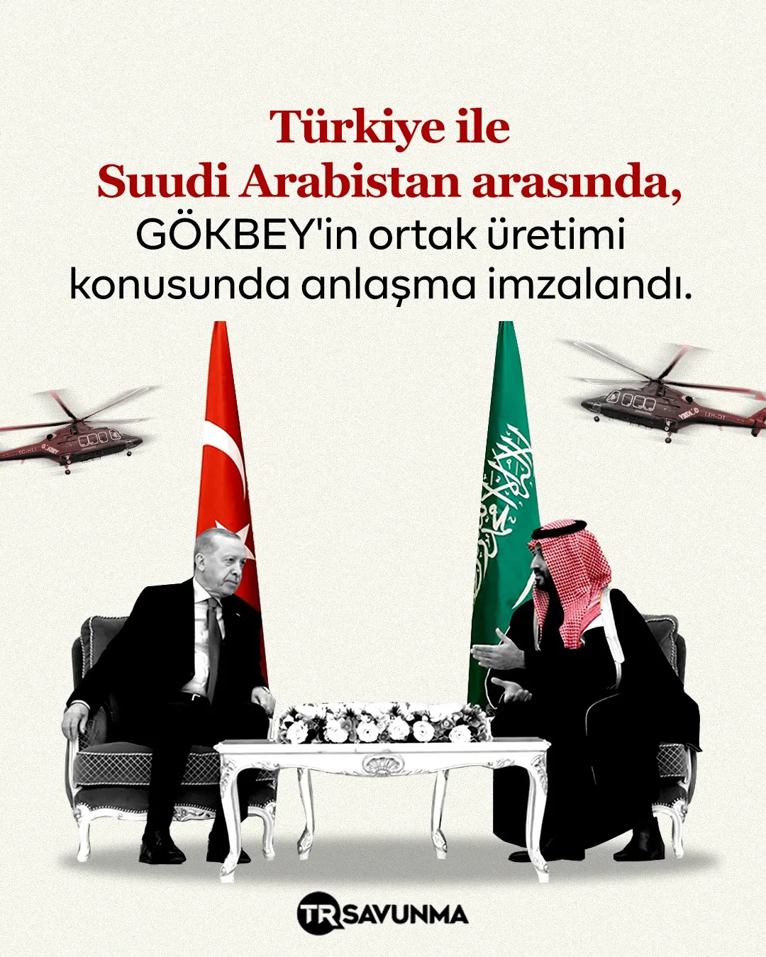 Suudi Arabistan Yatırım Bakanlığı ve Askerî Sanayiler Otoritesi, GÖKBEY helikopterinin ortak üretimi konusunda TUSAŞ'la mutabakat zaptı (MoU) imzaladı. Nihaî sözleşme niteliği bulunmayan MoU, GÖKBEY için Suud topraklarında montaj hattı kurulması ve hangi parçaların Araplar tarafından üretilebileceğinin belirlenmesi konusunda yol haritası oluşturulacağını ifade ediyor.