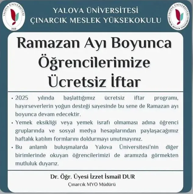 Yalova Üniversitesi'nden öğrencilere "Ramazan" müjdesi geldi. Yalova Üniversitesi Çınarcık Meslek Yüksekokulu Müdürü Dr. Öğretim Üyesi İzzet İsmail Dur, geçtiğimiz Ramazan ayında başlattıkları ücretsiz iftar programının hayırseverlerin yoğun desteğiyle bu yıl da devam edeceğini söyledi.